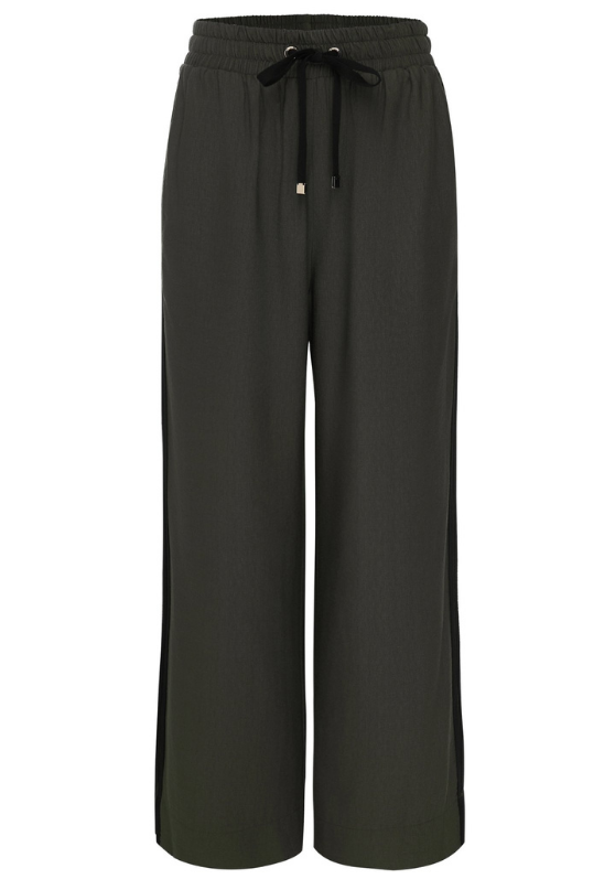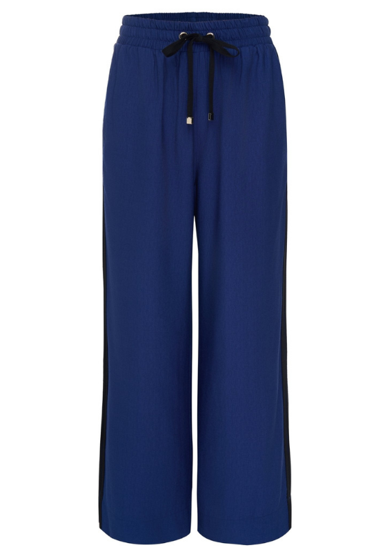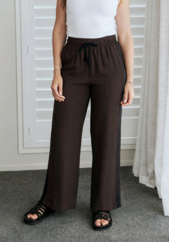 Cream contrast stripes run down each leg for a sport-luxe edge, while subtle side splits at the hem add movement and a touch of ease. The fit is streamlined yet relaxed, with a wide-leg silhouette that flatters every shape and pairs beautifully with tanks, tees, or a crisp shirt.