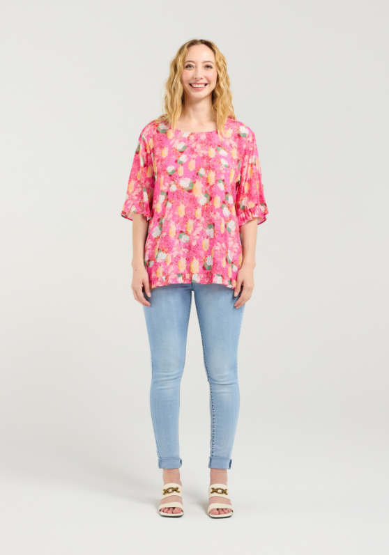 The frills on the sleeves and hemline give Dorothy top a playful look. It has a round neckline, a button-down detail at the back, and a distinctive print.