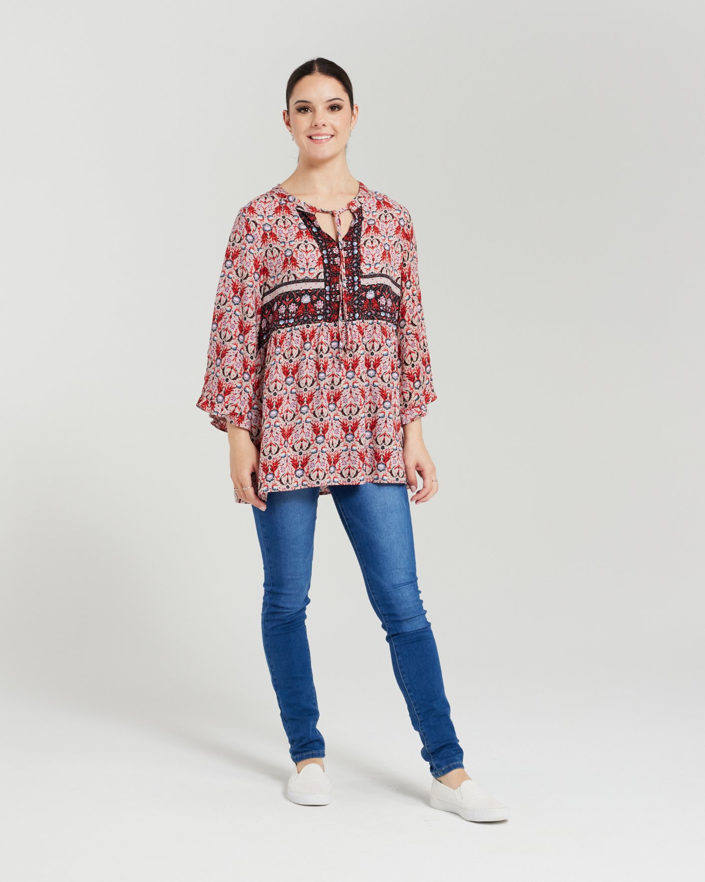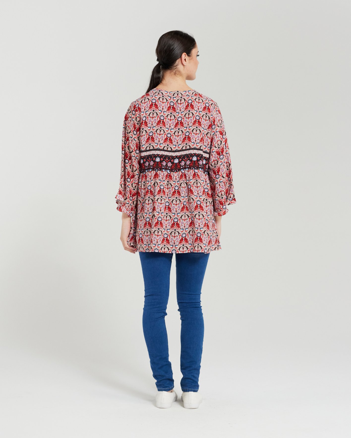 Floral print top with flowy sleeves, v neck with ties and contrasting panel below bust