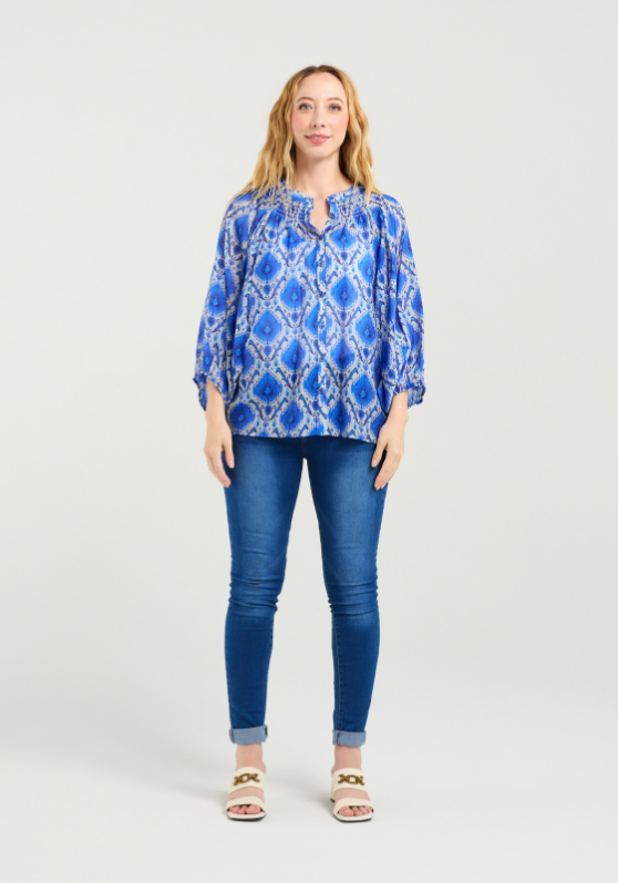 This effortlessly chic top features a button-down front and an elasticated, ruched neckline for a flattering fit. The elasticated 3/4 sleeves and flowy, drapey fabric combine for a relaxed yet polished silhouette.